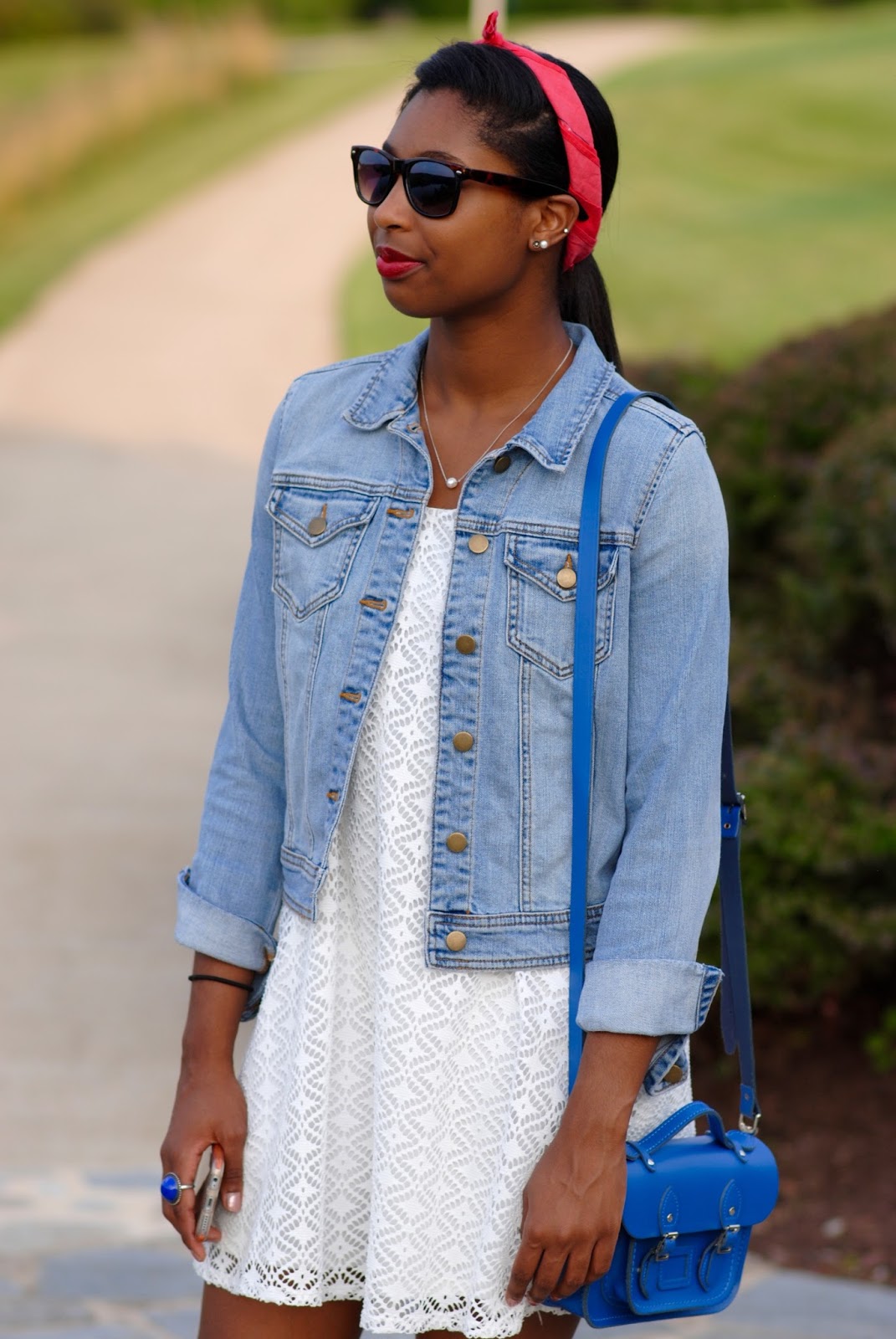 As promised, my second (and favorite) RWB look. I love the classic american feel of the jean jacket and bandanna (I had a Rosie the Riveter moment) with the red lips. Overall a cute but casual twist for an outdoor celebration. Ironic that tomorrow I'm heading to London and Paris (both with US colors), but I'm still glad I get to spend this great holiday in a place where its celebration is not so... tongue-in-cheek. Otherwise, I'm so excited for my trip!! I'll have a couple usual posts this week with a full European download when I return!