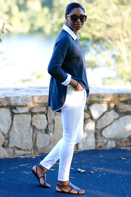 sweater (other colors here) || button down || white denim || sandals (similar) || bag (similar) || sunglasses || boyfriend watch (rose gold here) || necklace || double-sided earrings