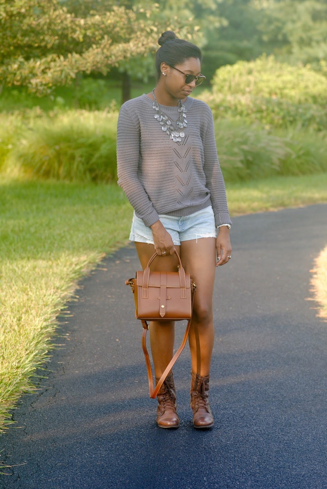open-stitch sweater (similar) || festival shorts || combat boots || satchel (similar) || glass necklace (similar) || sunglasses || watch (in grey here)
